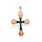 Cruz moderna realizada integramente en plata 925 con 4 cabullones de quarzo rosado.