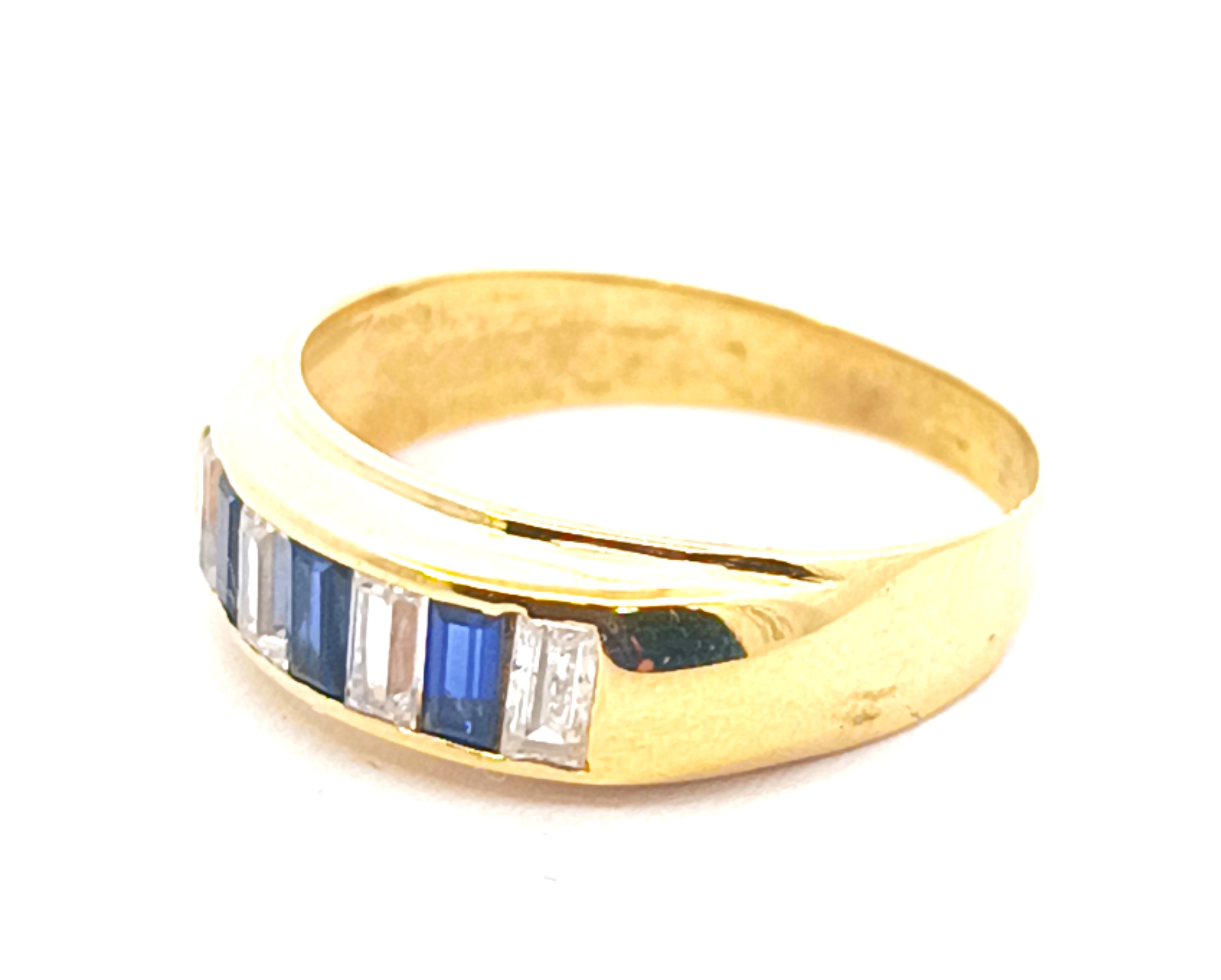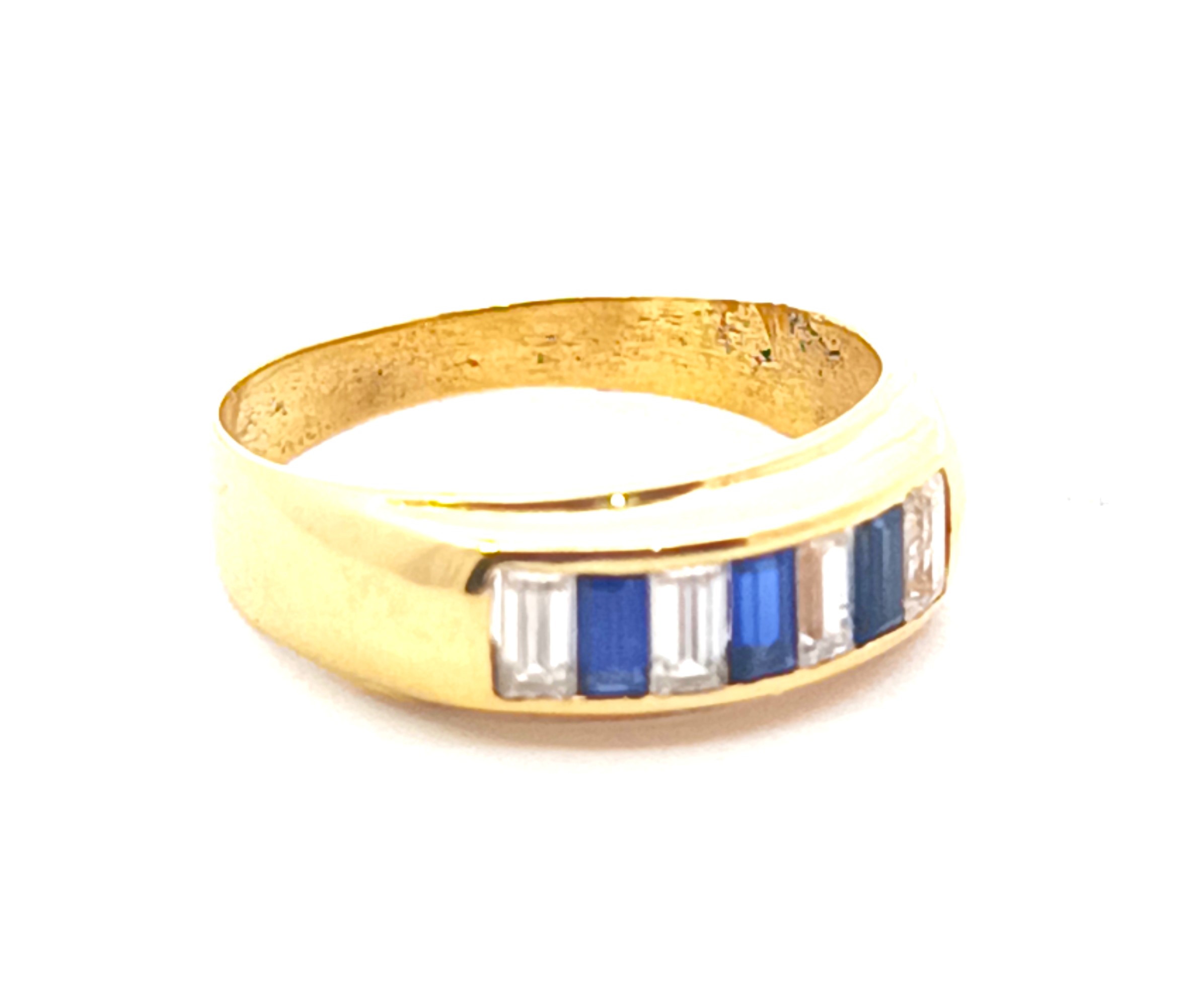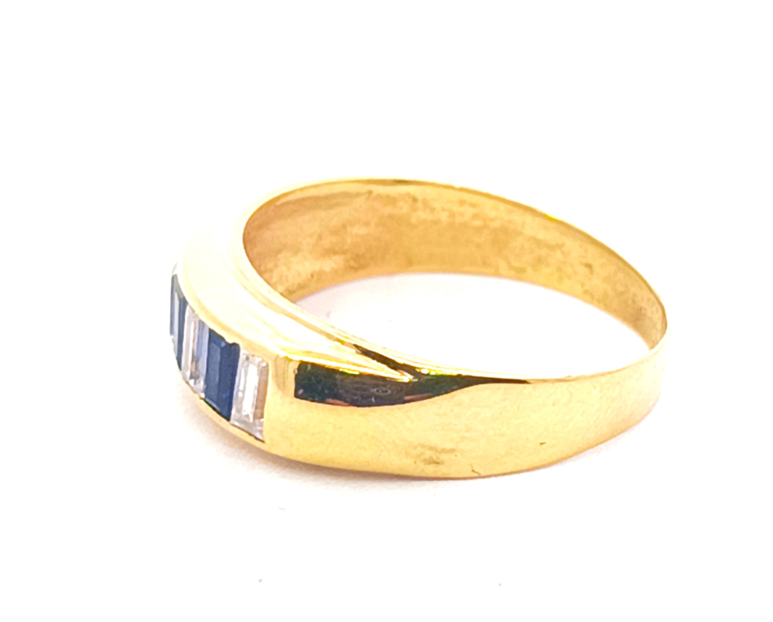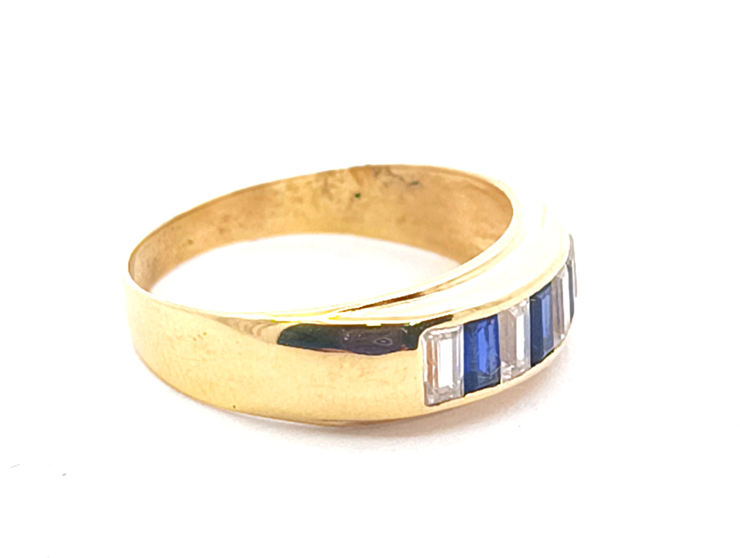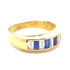 Anillo moderno modelo medio sinfin realizado a mano en oro 18k. Posee baguette de zafiros azules y blancos. Reconstituidos.