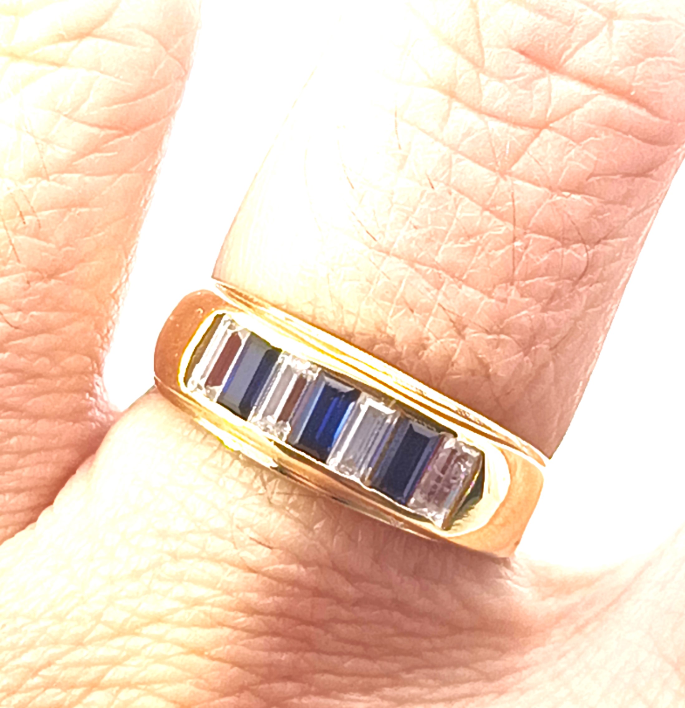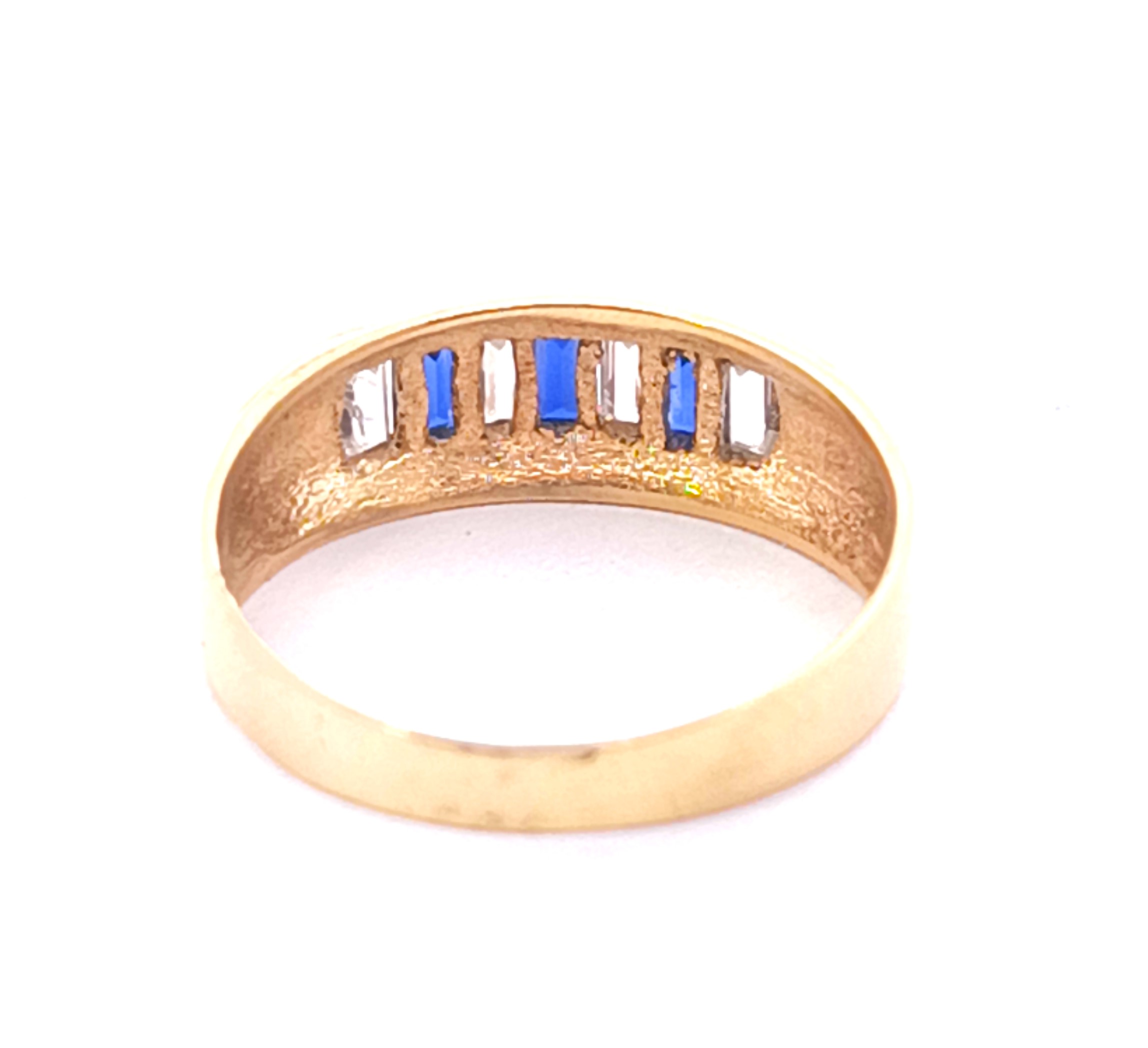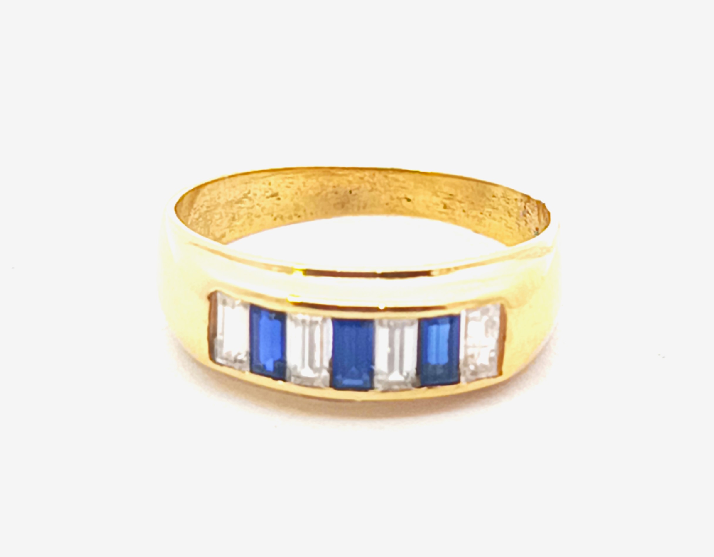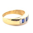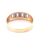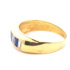 Anillo moderno modelo medio sinfin realizado a mano en oro 18k. Posee baguette de zafiros azules y blancos. Reconstituidos.