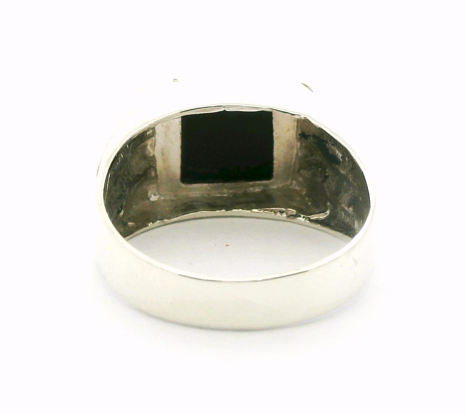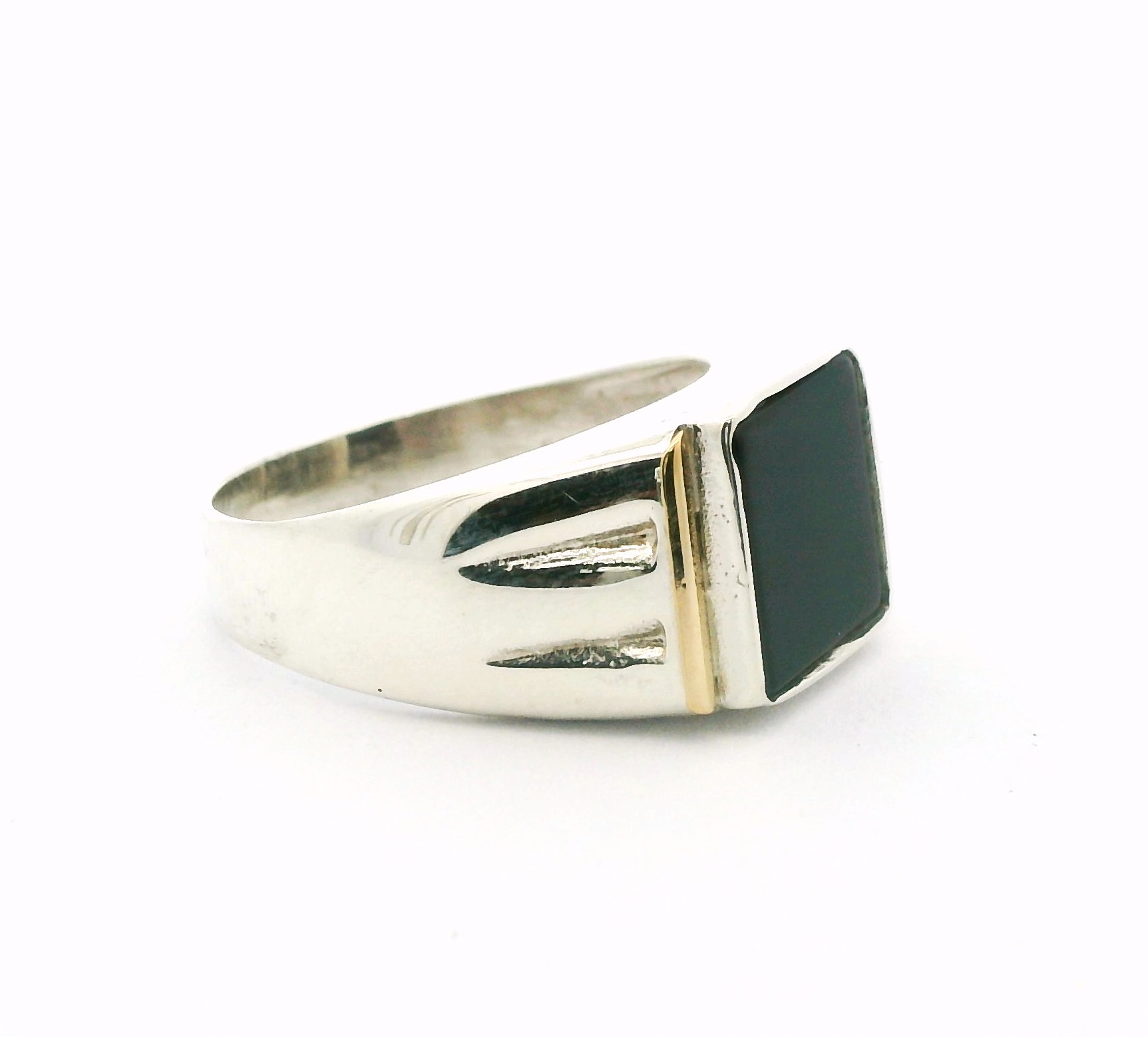 Anillo de diseño sello realizado en plata 925 maciza , con detalles de oro 18 k . Posee onix central cuadrado.