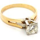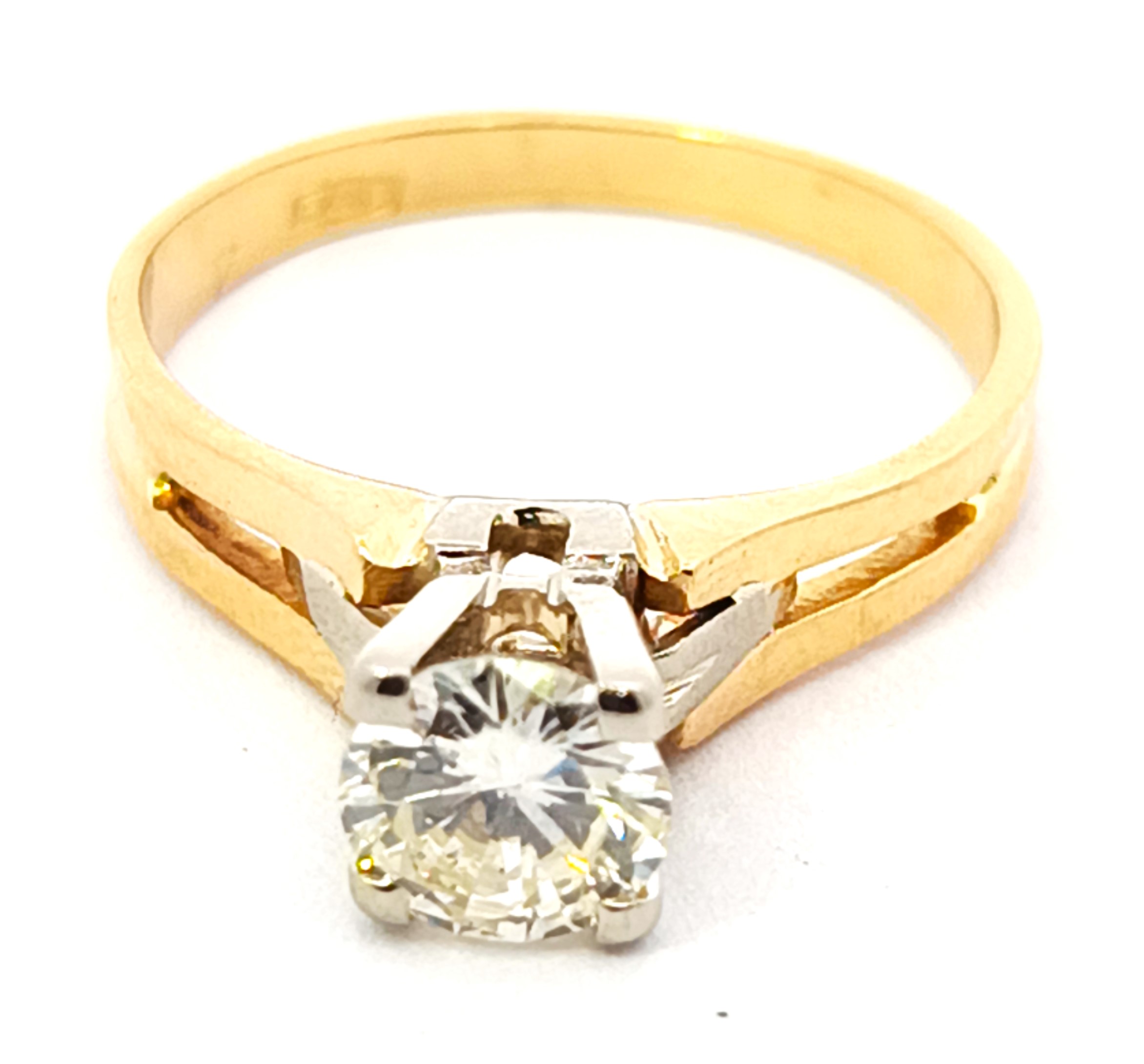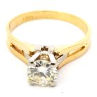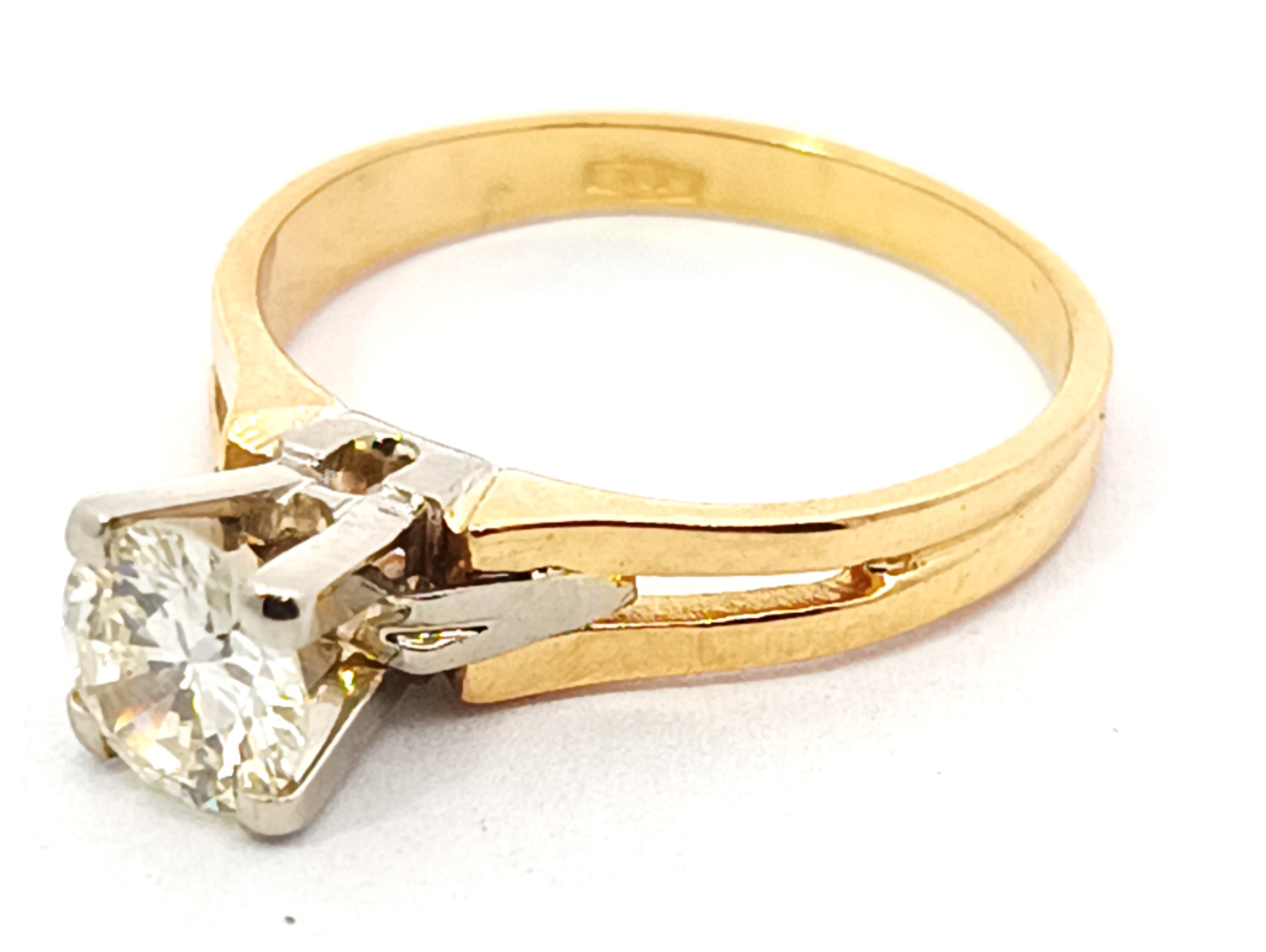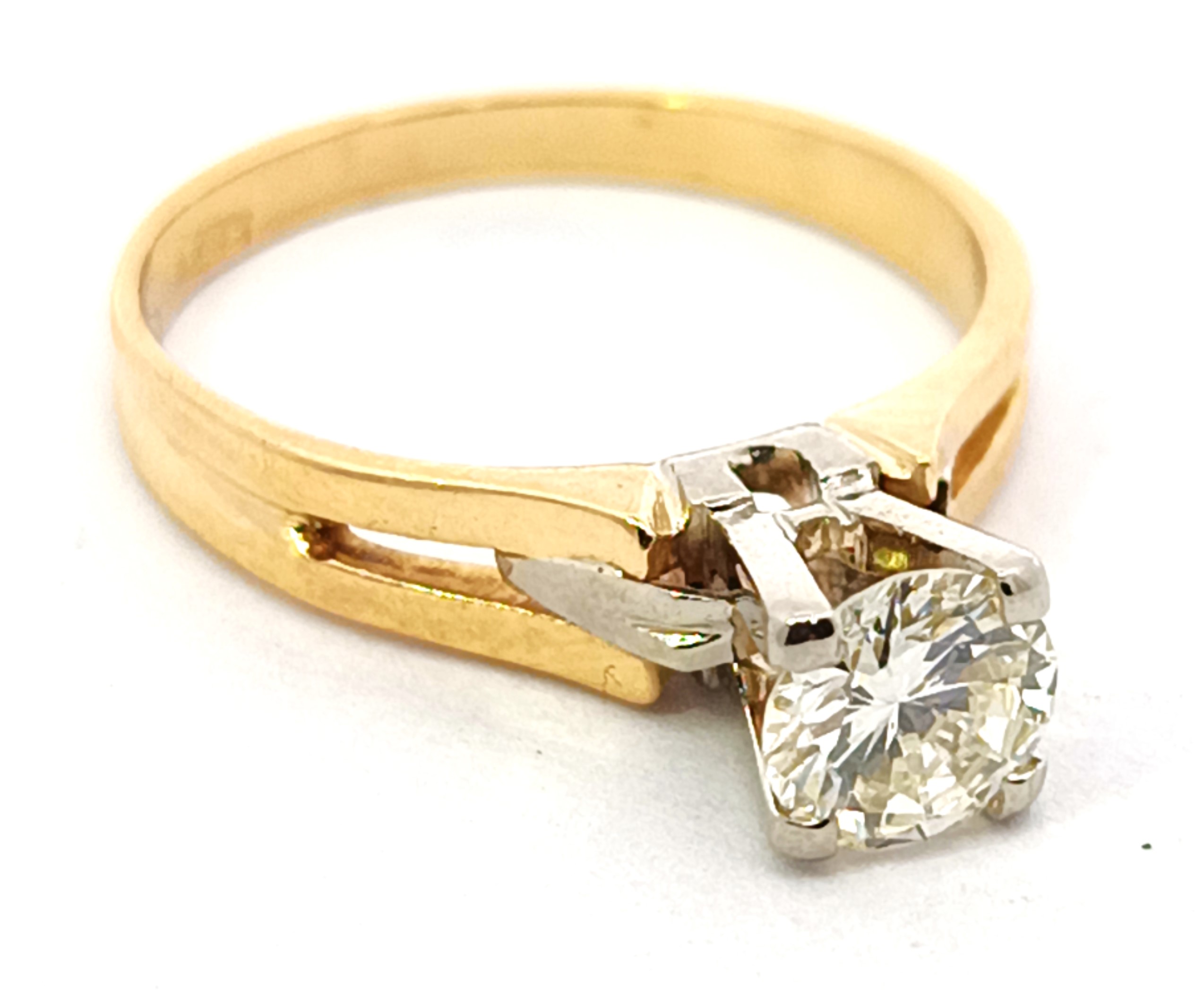 Anillo solitario de compromiso de diseño moderno , realizado en oro 18k amarillo y blanco. Brillantes de 0,60 ct ( mas de medio kilate ).