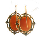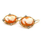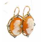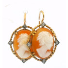 Par de aros antiguos , realizados integramente a mano , en oro 18k , pieza central camafeo antiguo tallado a mano con imagen de mujer y brillantes engarzados.