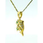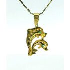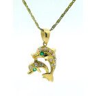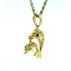 Dije moderno realizado en oro 18k , modelo delfines dobles. Zafiros blancos y esmeralda engarzada.