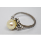 Hermoso anillo antiguo, oro 18 kilates , color de oro blanco , brillantes autenticos talla 8 facetas , maxima calidad y pureza , color blanco h , peso en kilates: 0,20 ct , perla central natural de cultivo , 8 mm , nacar sin imperfecciones , color blanco plata , peso en gramos de la alhaja: 5,1 gr