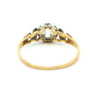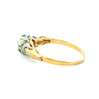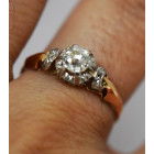 Anillo antiguo de compromiso , oro 18k , engarces sobre platino 950 , brillante central talla antigua europea de maxima calidad y color , peso en kilates: 0,50 ct , a ambos lados posee brillantes rose cut completando este engarce , peso en gramos de la alhaja: 0,52 ct totales