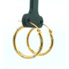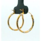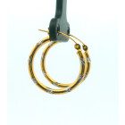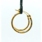Par de aros argollas modernas realizada en oro 18k combinando oro amarillo y blamco. Trabajadas.