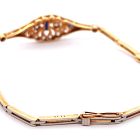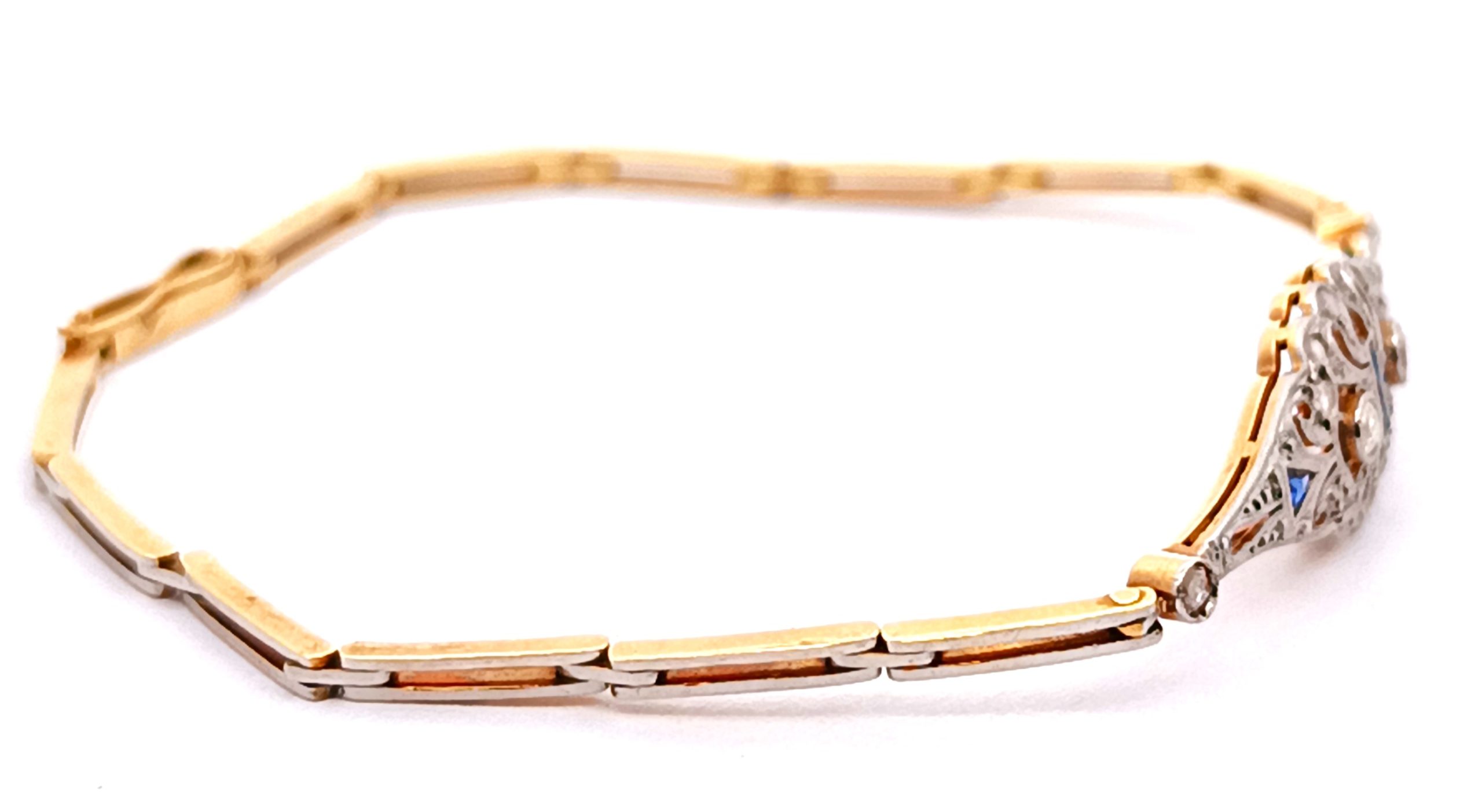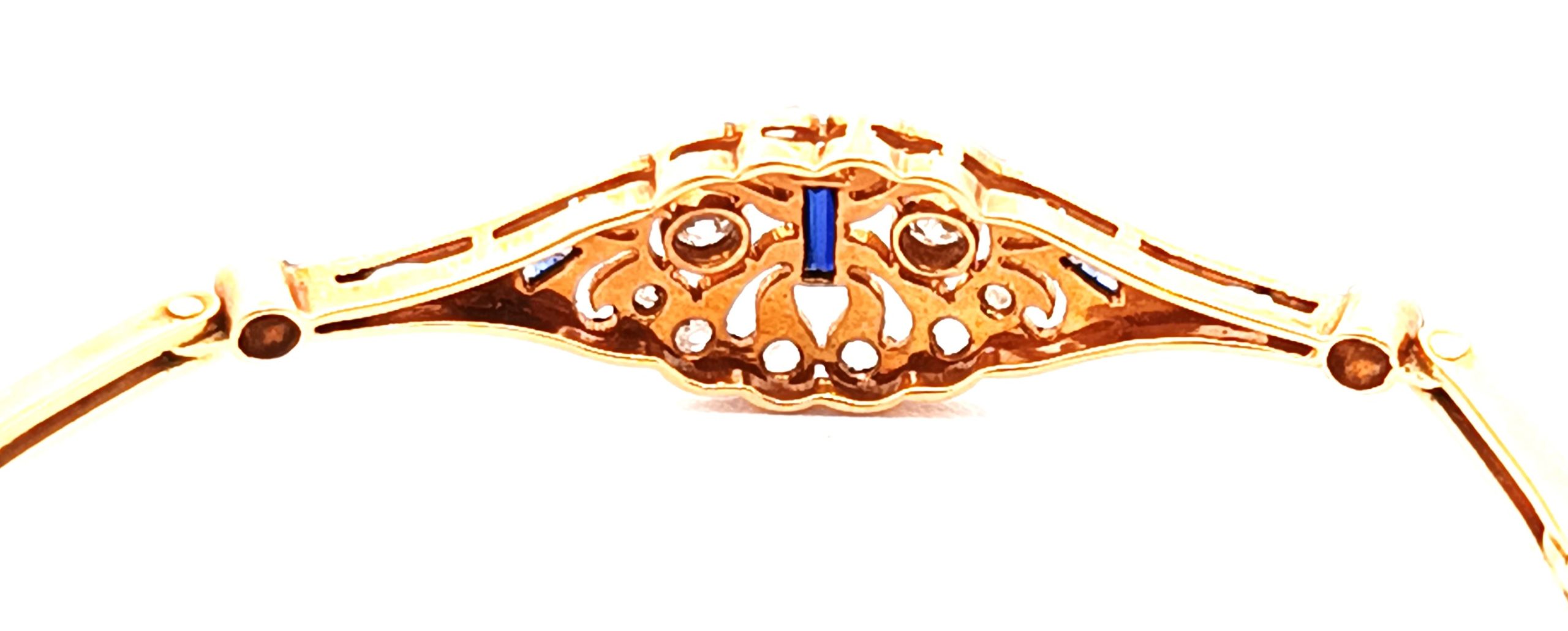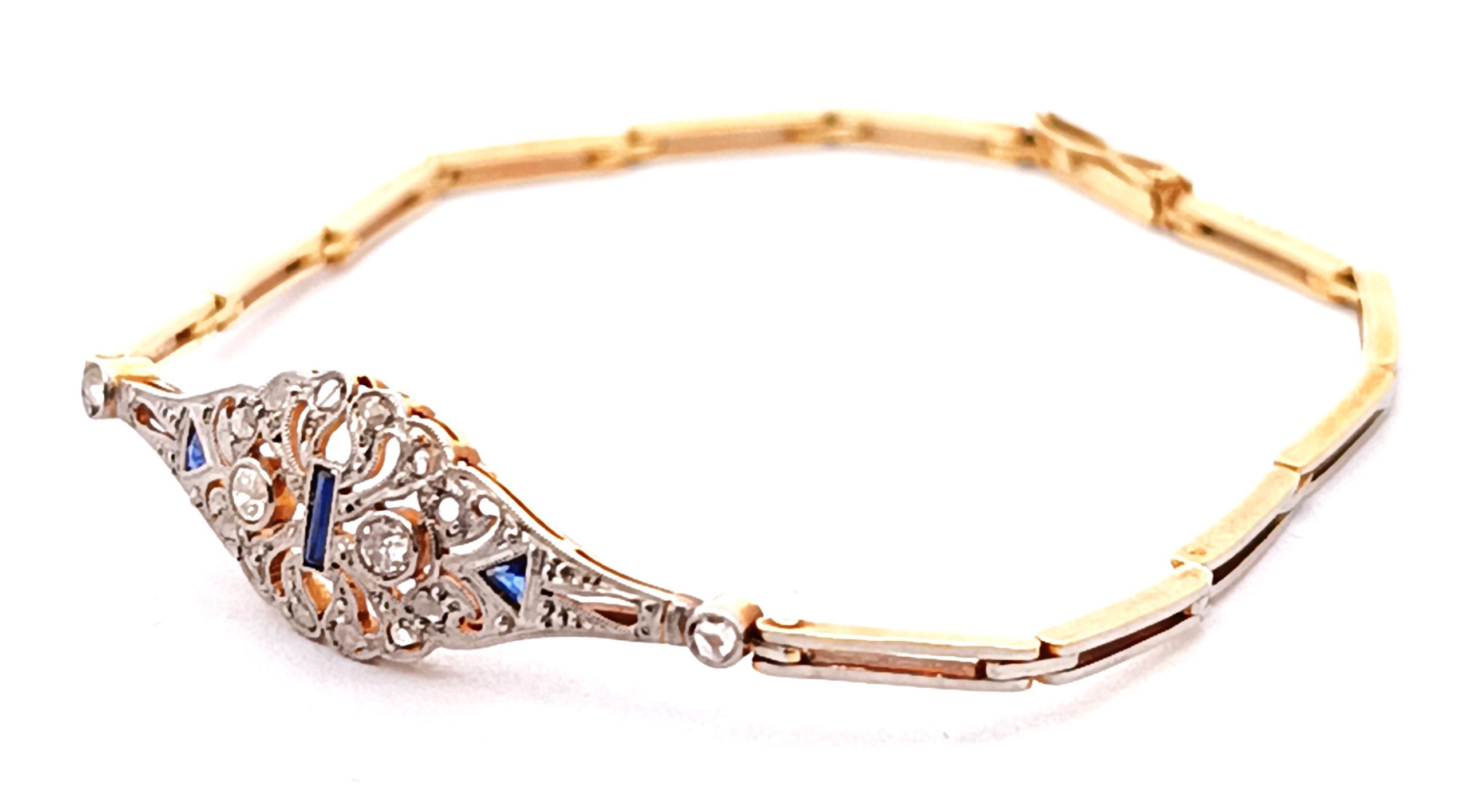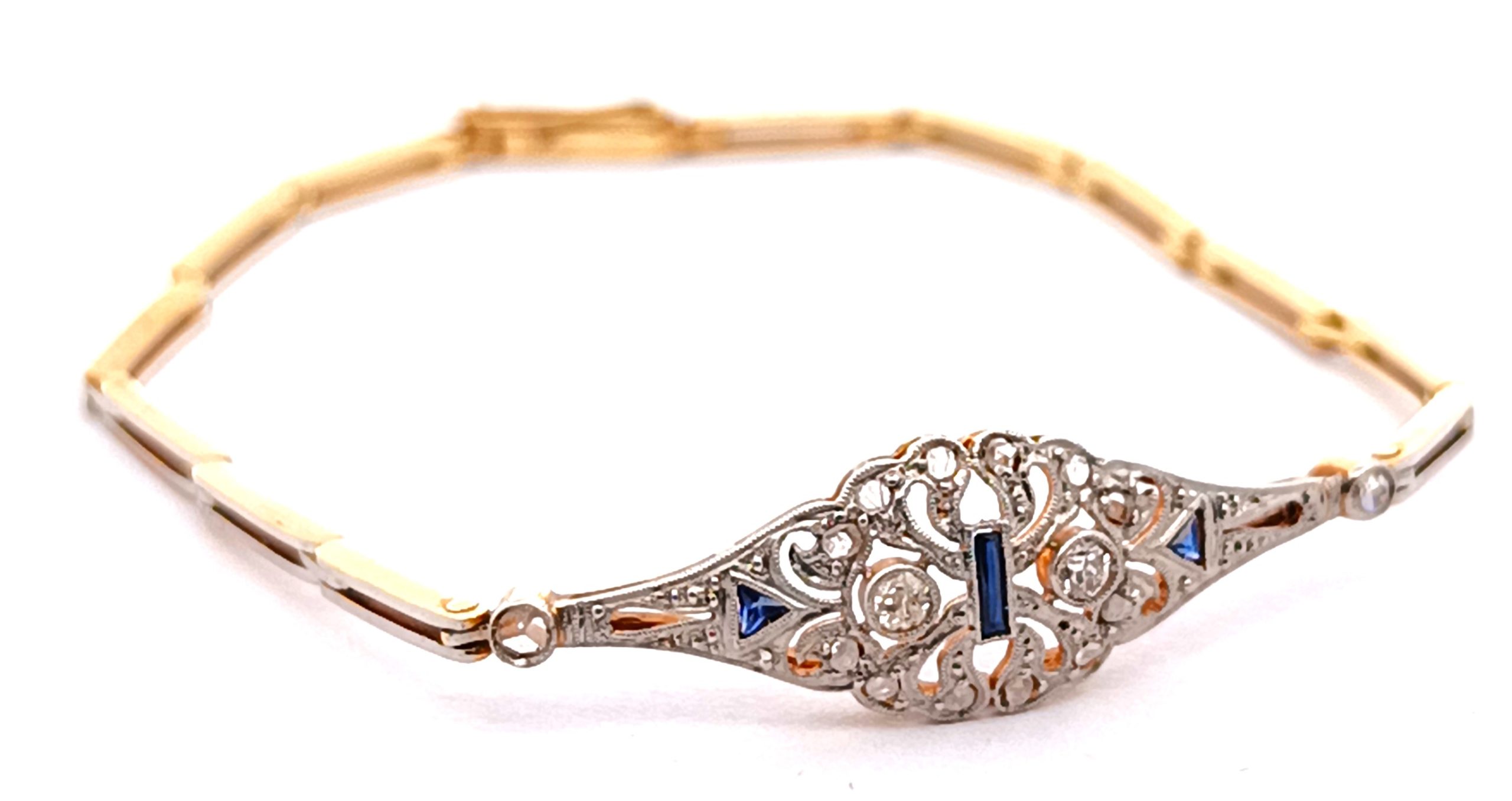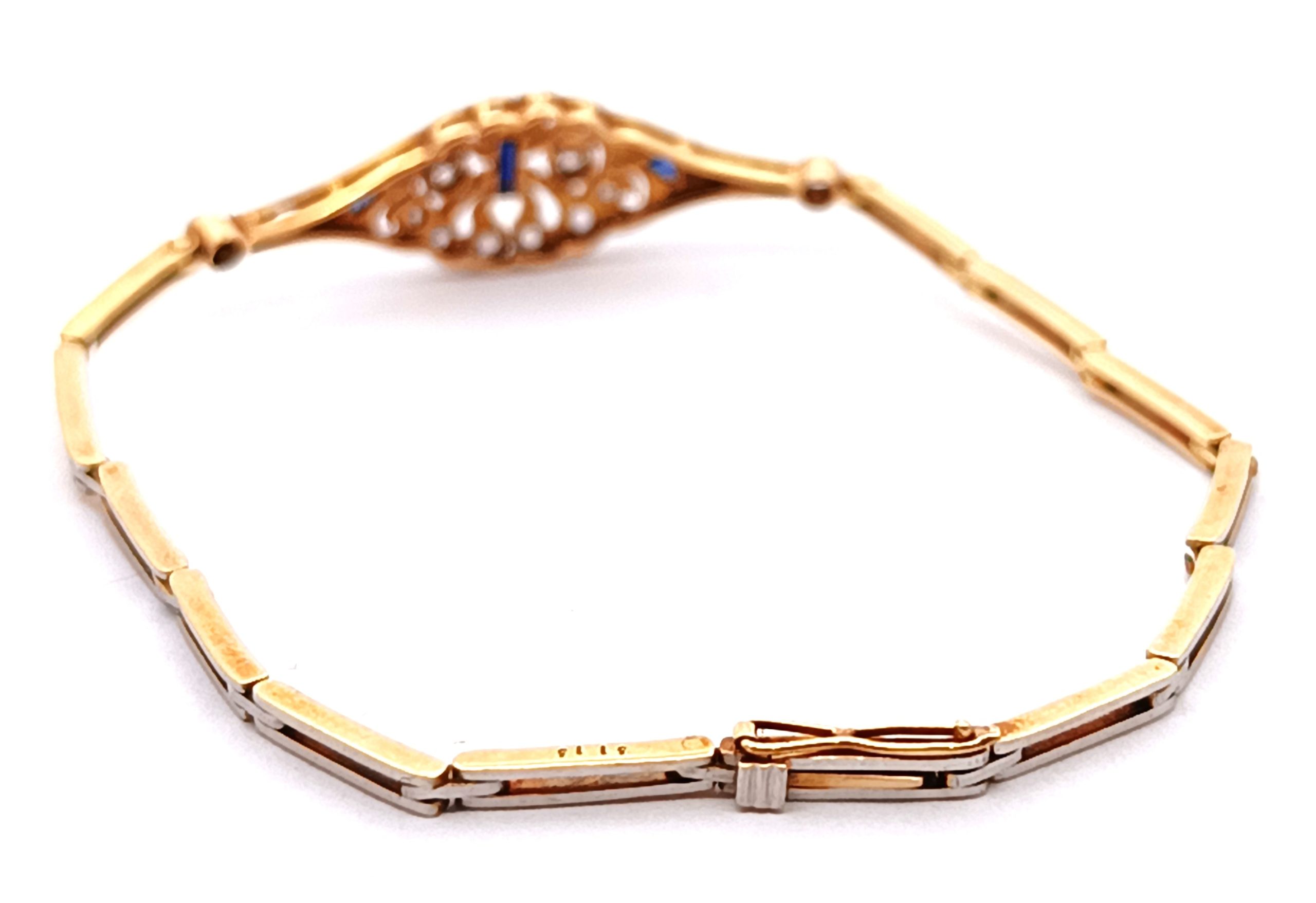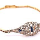 Pulsera antigua Art deco realizada en oro 18k y engarces sobre platino 950. Posee brillantes talla rose cut y zafiros azules ajustados a la pieza.